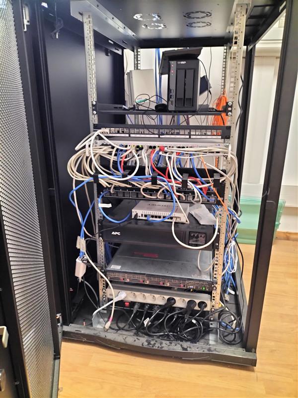 Sur cette image, on peut voir une baie avec son matériel mal installé et un onduleur qui ne fonctionne plus. Mon projet a été de changer l'onduleur ainsi que de réinstaller la baie comme il le fallait.