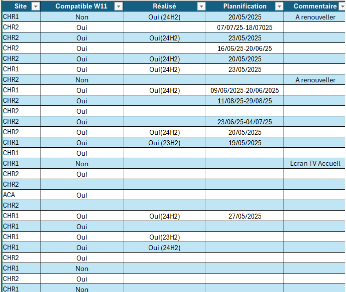 Sur les sites de Châteauroux, il y a certains ordinateurs qui ne sont pas encore sous Windows 11. Mon projet est de faire le tableau avec la liste des ordinateurs à mettre à jour, de planifier les mises à jour et pour finir de les lancer.